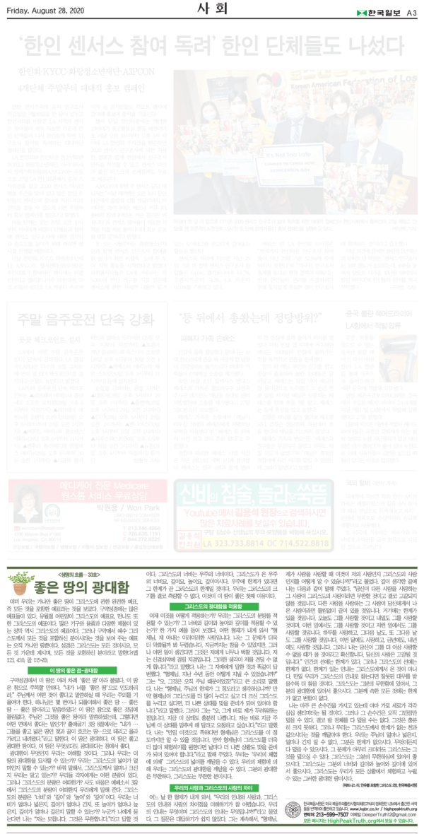 나는 아주 큰 손수건을 가지고 있는데 아마 가로 세로가 각각 삼십 센티미터는 될 것이다. 그러나 그 손수건은 오직 그만큼만 덮을 수 있다. 결코 방 전체를 다 덮을 수는 없다. 그것은 충분히 크지 못하다. 그러나 우리는 그리스도께서 한계가 없는 천과 같으시다는 것을 깨달아야 한다. 우리는 주님이 얼마나 넓은지, 얼마나 긴지 알 수 없다. 그분은 한계가 없으시다. 무엇이든지 다 덮을 수 있으시다. 그 문제가 아무리 크더라도 그리스도는 그것을 덮으실 수 있다. 그리스도는 그분의 무한하심에 있어서 좋으시다. 그리스도는 그분의 너비와 길이와 높이와 깊이에 있어서 좋으시다. 그리스도는 우리가 모든 상황에서 체험하고 누릴 수 있는 그러한 광대한 땅이시다.